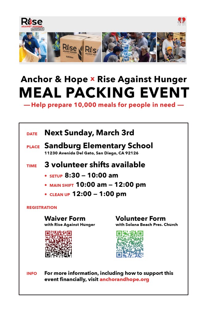 - Via check in-person • Checks to Solana Beach Presbyterian Church, in memo “Anchor & Hope RAH”