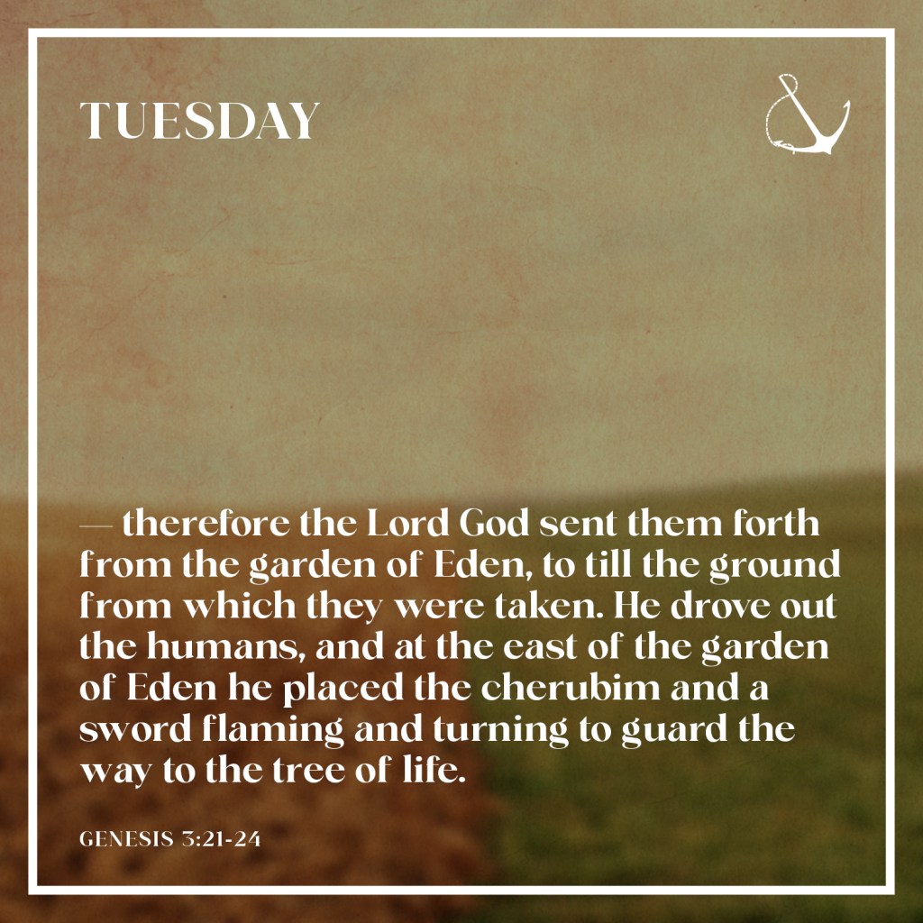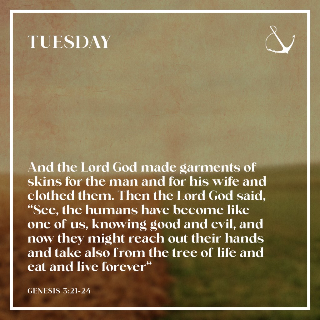 And the Lord God made garments of skins for the man and for his wife and clothed them. Then the Lord God said, “See, the humans have become like one of us, knowing good and evil, and now they might reach out their hands and take also from the tree of life and eat and live forever”— therefore the Lord God sent them forth from the garden of Eden, to till the ground from which they were taken. He drove out the humans, and at the east of the garden of Eden he placed the cherubim and a sword flaming and turning to guard the way to the tree of life.