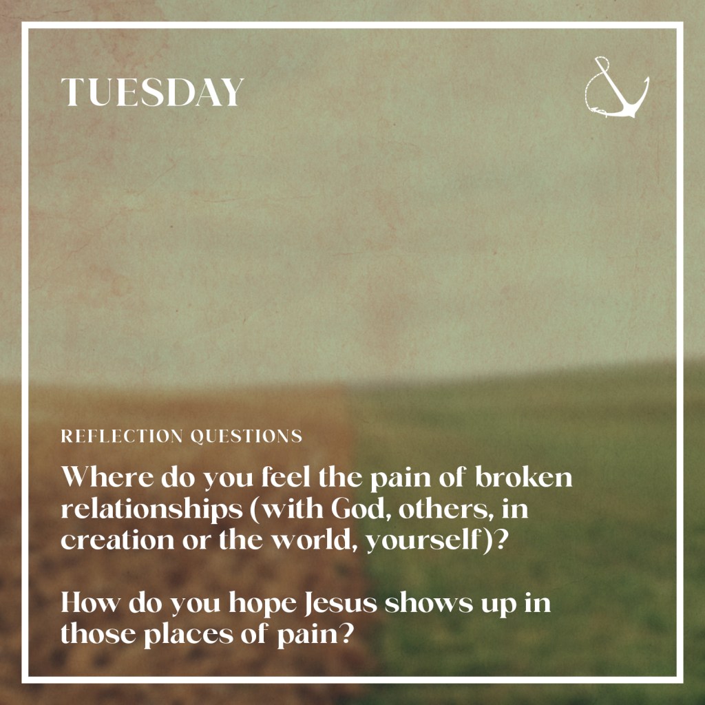 - Where do you feel the pain of broken relationships (with God, others, creation, yourself)?