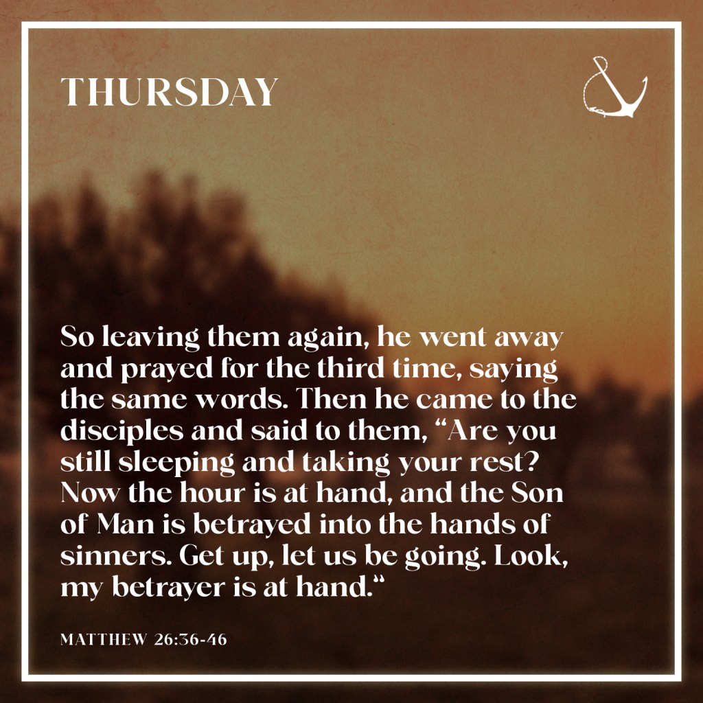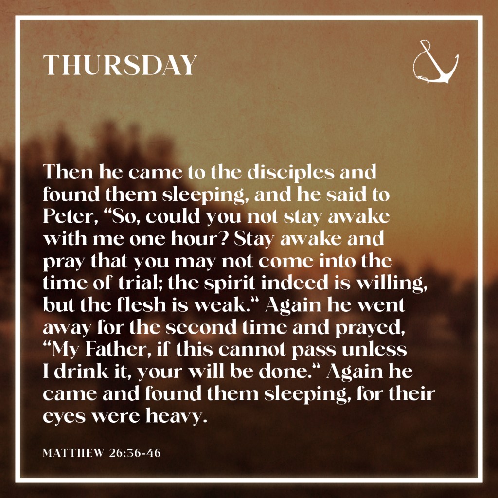Then Jesus went with them to a place called Gethsemane, and he said to his disciples, “Sit here while I go over there and pray.” He took with him Peter and the two sons of Zebedee and began to be grieved and agitated. Then he said to them, “My soul is deeply grieved, even to death; remain here, and stay awake with me.” And going a little farther, he threw himself on the ground and prayed, “My Father, if it is possible, let this cup pass from me, yet not what I want but what you want.” Then he came to the disciples and found them sleeping, and he said to Peter, “So, could you not stay awake with me one hour? Stay awake and pray that you may not come into the time of trial; the spirit indeed is willing, but the flesh is weak.” Again he went away for the second time and prayed, “My Father, if this cannot pass unless I drink it, your will be done.” Again he came and found them sleeping, for their eyes were heavy. So leaving them again, he went away and prayed for the third time, saying the same words. Then he came to the disciples and said to them, “Are you still sleeping and taking your rest? Now the hour is at hand, and the Son of Man is betrayed into the hands of sinners. Get up, let us be going. Look, my betrayer is at hand.”