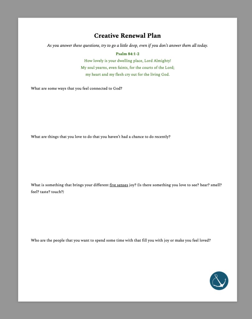As Pastor Jeya shared on Sunday, we need to be intentional about our plans for renewing our creativity. Click on the image below to download a PDF so that you can begin reflecting on and initiating your Creative Renewal Plan:
